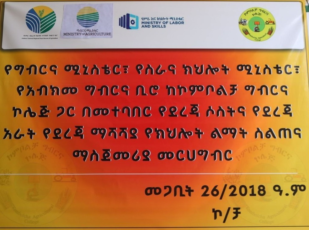 የግብርና ሚኒስቴር፣ የስራና ክህሎት ሚኒስቴር፣ የአብክመ ግብርና ቢሮ ከኮምቦልቻ ግብርና ኮሌጅ ጋር በመተባበር ለቀበሌ ልማት ጣቢያ ሰራተኞች የደረጃ ሶስትና የደረጃ አራት የደረጃ ማሻሻያ የክህሎት ልማት ስልጠና ማስጀመሪያ መርሀግብር አካሂዷል።